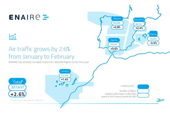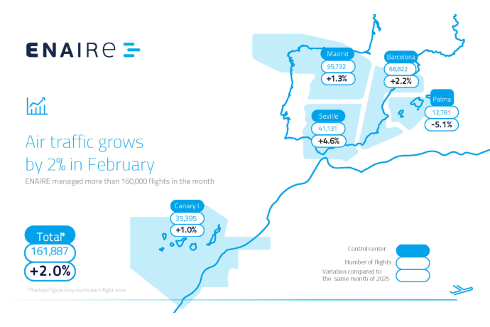 ENAIRE, Spain’s state-owned air navigation manager, handled more than 160,000 flights (161,887) in February 2026, 2.0% more than in the same month of 2025, a record year.
