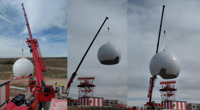 Las tareas de renovación del radar de Barajas comenzaron hace 2 meses con la construcción del nuevo radomo sobre el terreno, proceso que ha culminado en esta semana con éxito. Para el izado del radomo, la antena y el pedestal nuevos se ha necesitado un día entero de trabajo en condiciones meteorológicas favorables.
