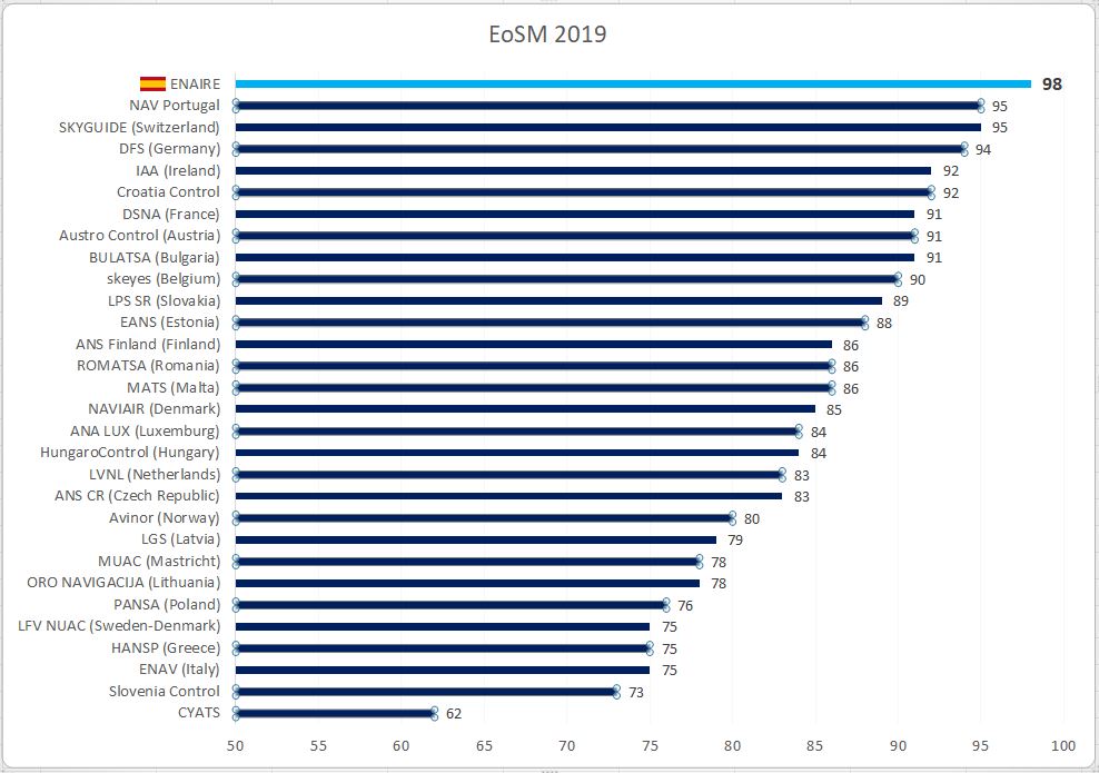 According to this European EoSM standard, the level of maturity of ENAIRE's Security Management System reached 98.12% in 2019. This places ENAIRE at the top position in operational safety among the 30 air navigation providers that were analysed.