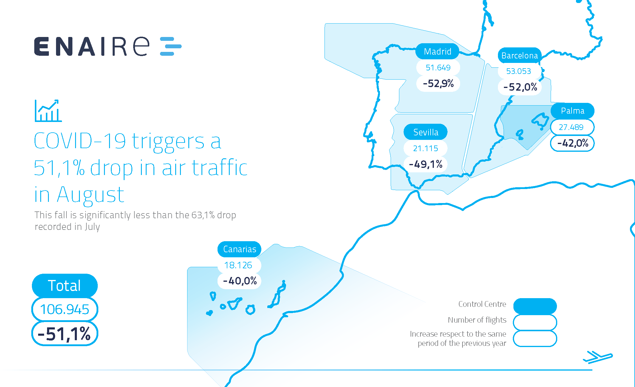 ENAIRE managed 603,901 flights from 1 January to 31 August (-58.6%), of which 321,508 were international (-62.2%), 152,357 (-47.7%) were domestic and 130,036 (-58.7%) were overflights.