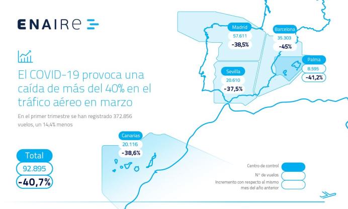 La pandemia de COVID-19 está suponiendo una reducción del tráfico aéreo sin precedentes, a nivel mundial, europeo y español. En marzo, ENAIRE gestionó 92.895 vuelos, un 40,7% menos que en marzo de 2019. En el caso de Europa, la caída media ha sido del 41,1%, ligeramente superior a la española.