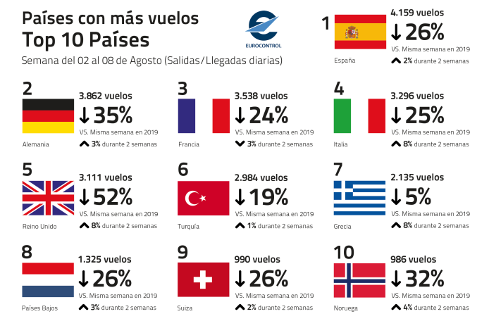 Esta tendencia en el liderazgo de la recuperación del número de vuelos en España se mantiene en la primera semana de agosto donde la caída ha sido del 26% comparativamente con la misma semana en 2019.
