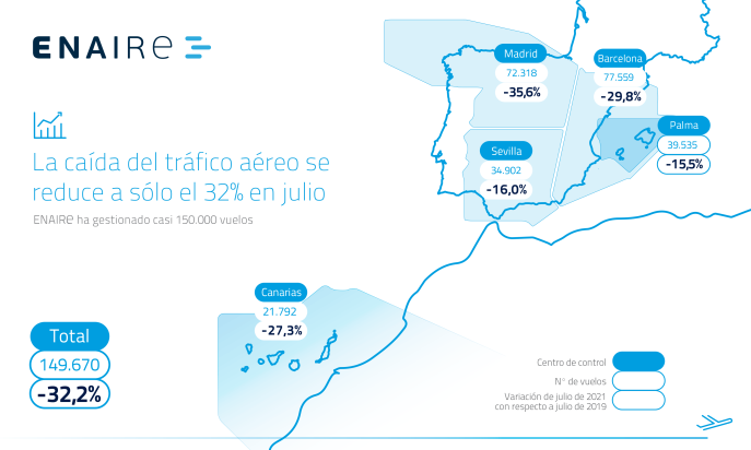 Los vuelos gestionados por ENAIRE en julio han sido cerca de 150.000 (149.670), sólo el 32,2% menos que en el mismo mes de 2019, año de referencia para la comparación de los datos, ya que en 2020 el tráfico cayó a niveles mínimos como consecuencia de los efectos de la COVID.