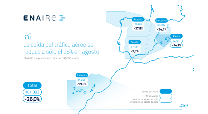 Todos los centros de control de ENAIRE registraron caídas en el tráfico en agosto con respecto al mismo mes de 2019: Sevilla, el 9,7%; Palma, el 14,1%; Canarias, el 19,6%; Barcelona, el 24,7% y Madrid, el 27,8%.