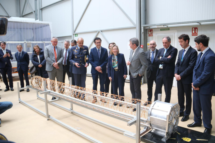 [El secretario de Estado José Antonio Santano y autoridades ante el modelo de ingeniería de la antena del satélite de Startical. Entre las autoridades, el director general de Startical, Enrique Laguna; el director de la Agencia Espacial Española, Juan Carlos Cortés Pulido; el director general INTA, teniente general Julio Ayuso Miguel; la directora de la Agencia Estatal de Seguridad Aérea (AESA), Montserrat Mestres; la secretaria de Estado de Defensa, María Amparo Valcarce García; el secretario de Estado de Transportes y Movilidad Sostenible y presidente de ENAIRE , José Antonio Santano; el director general de Aviación Civil, David Benito, y el presidente de Indra, Ángel Escribano].