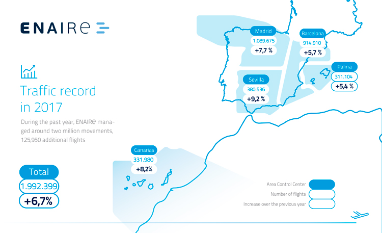 ENAIRE, the company of the Fomento Group that manages air traffic in Spain, has completed a historic 2017, with a total of 2 million flights, i.e. 126,000 flights more than in 2016.