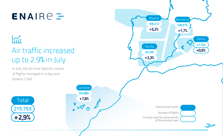ENAIRE, the company responsible for air traffic control in Spain and the 4th most important in Europe, operated 215,753 flights in July, 2.9% more than in the same period in 2017.