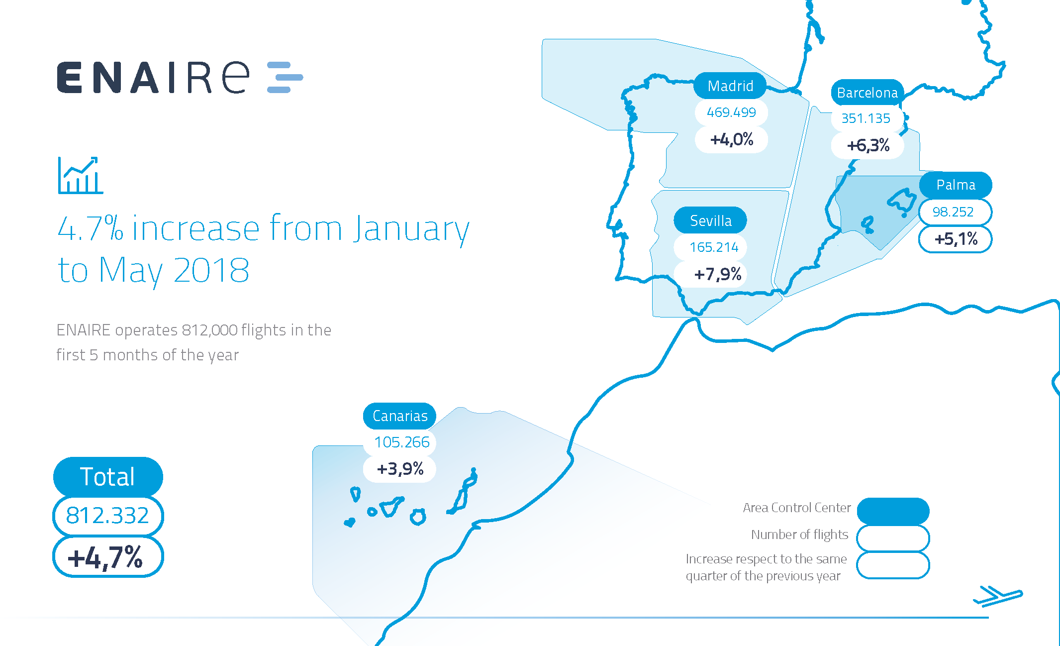 Flights have also increased at all ENAIRE control centres: Seville (7.9%, with 165,214 flights), Barcelona (6.3%, with 351,135), Palma (5.1%, with 98,252), Madrid (4.0%, with 469,499) and Canary Islands (3.9%, with 150,266).