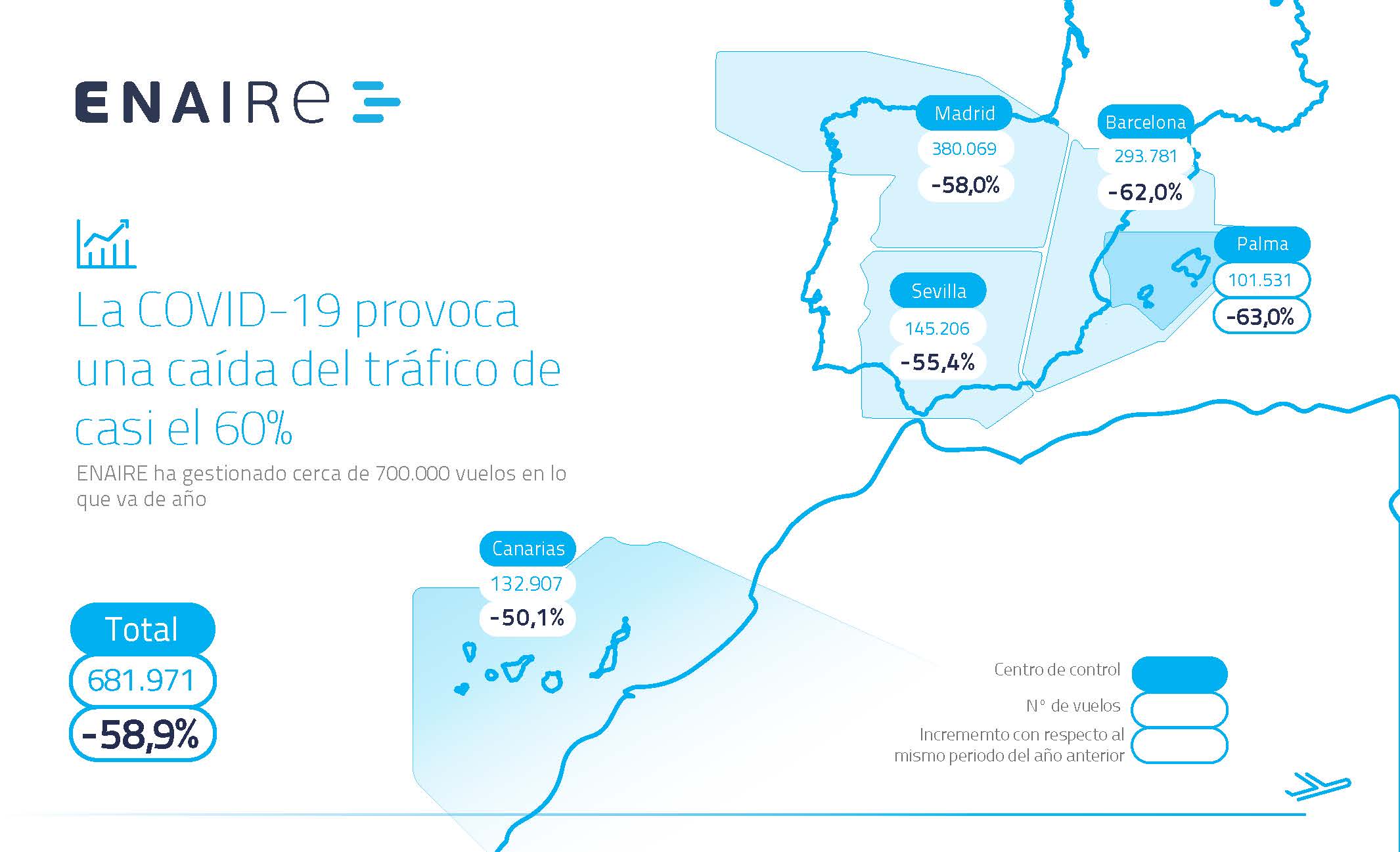 Los vuelos gestionados por ENAIRE hasta el tercer trimestre, de enero a septiembre, han sido 681.971, un 58,9% menos que en el mismo periodo del pasado año. Esta caída del tráfico aéreo, que afecta no sólo a España sino a toda Europa, ha sido provocada por los efectos de la pandemia de COVID-19.